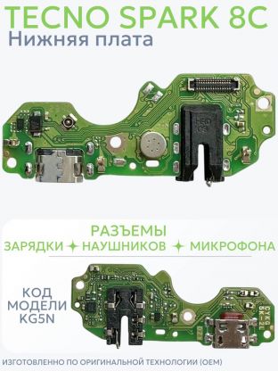 Нижняя плата для Tecno Spark 8C (KG5n, OEM) с разъемами зарядки, наушников и микрофоном